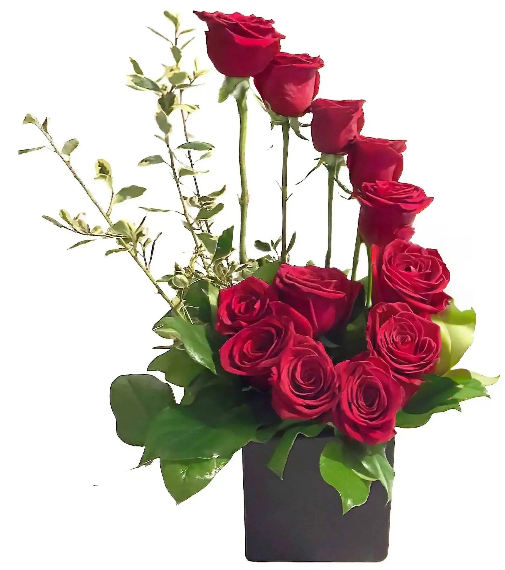 This stunning design follows the golden ratio, perfectly accented with seasonal greenery. Show your love with this breathtaking new take on roses (16'' tall and 6'' across). Other color options are also available upon prior request. Upgrades may include other types of flowers.