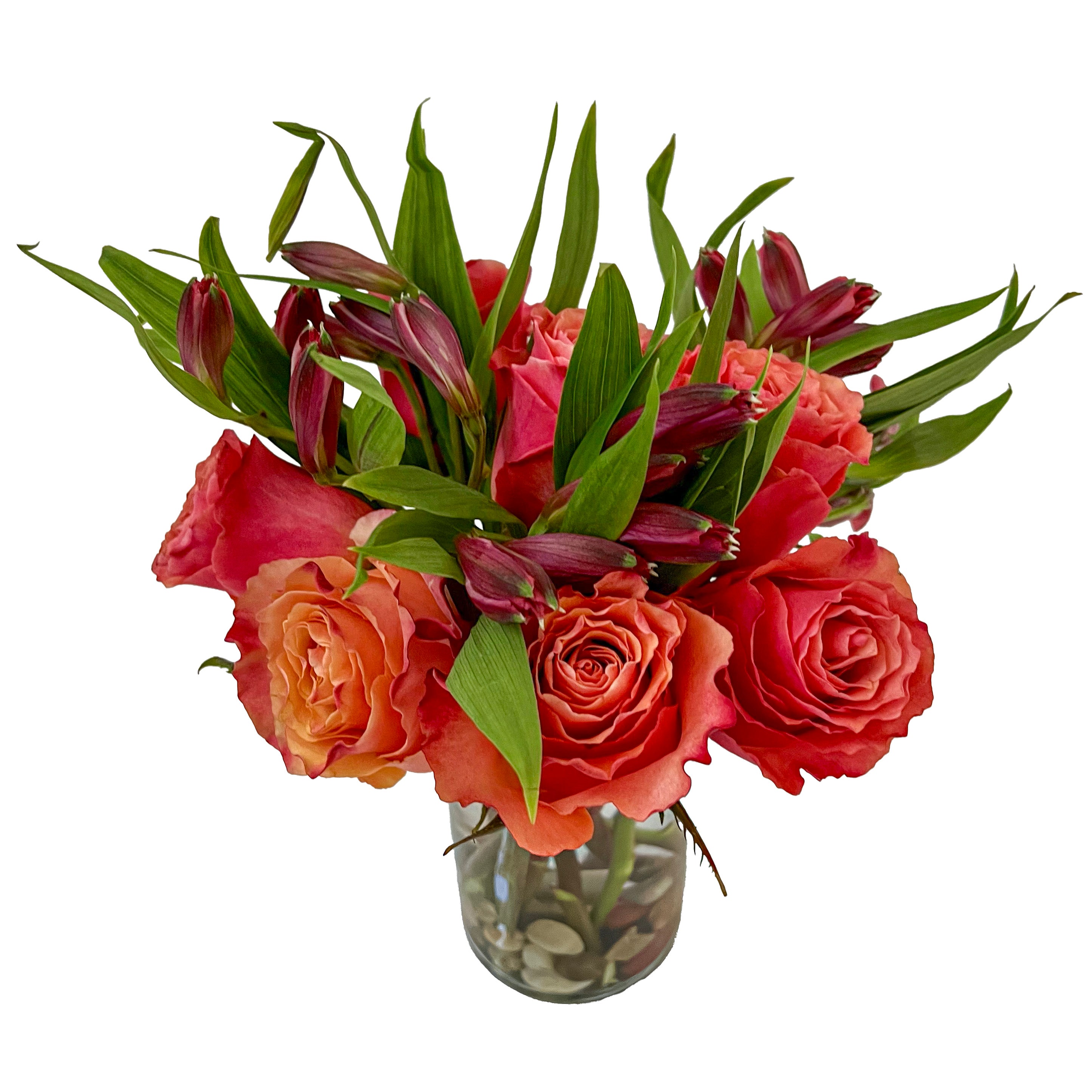 This arrangement looks ablaze with the warm colored roses and flaming red alstroemeria! The alstroemeria is super fresh and will open up with vibrant color! If the stones in the vase were sticks this would be the only campfire you can pass on to someone you love (Approximately 9" tall and 7" across)!