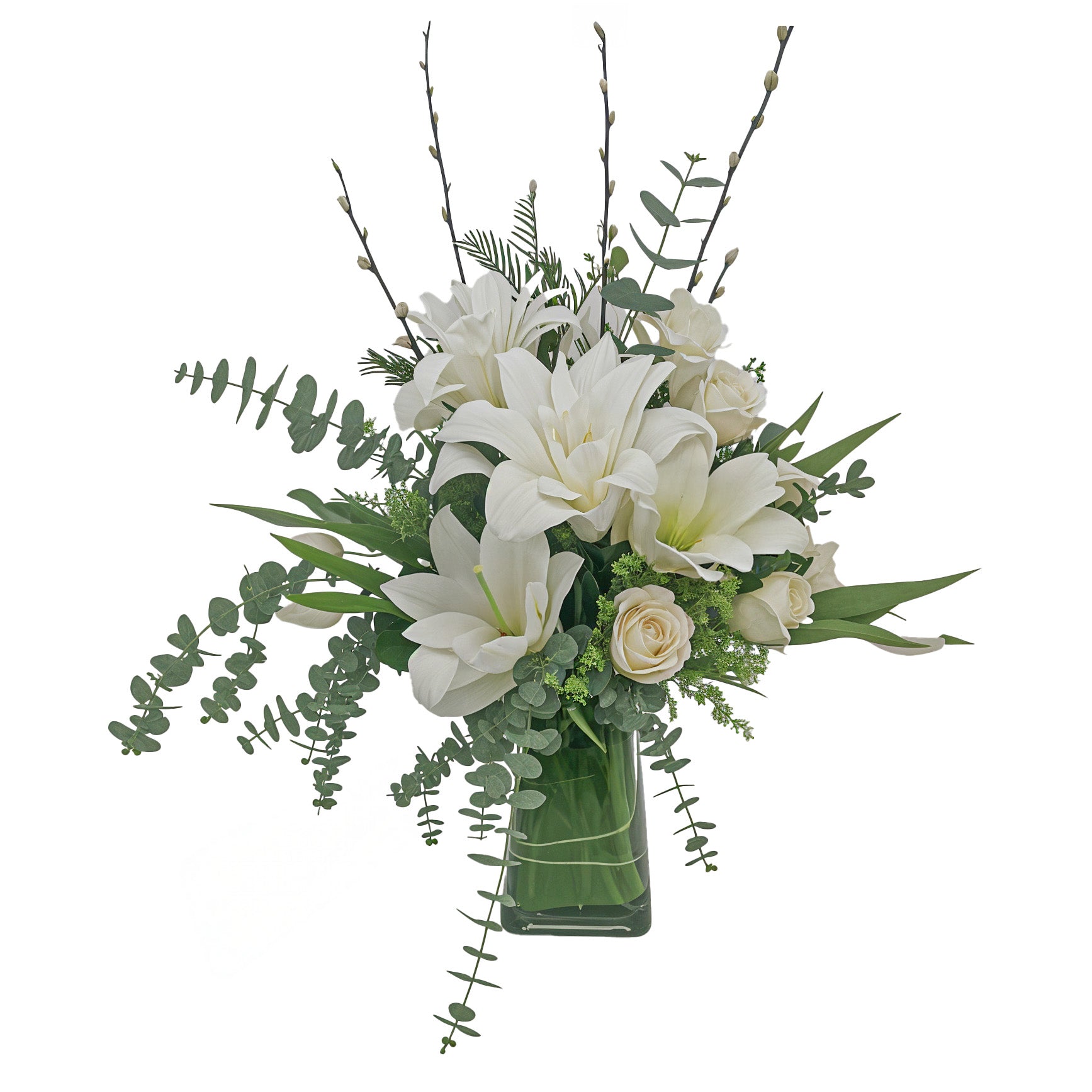 Casablanca lilies steal the show with this tall arrangement of white and cream flowers. the pussy willow and eucalyptus simply set the stage for these gorgeous lilies and roses. "I think this is the beginning of a beautiful friendship!" (Approximately 24'' tall and 12-15'' across)
