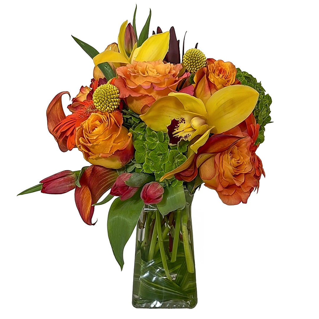 Fall sizzles with this arrangement of glorious harvest colors including: green hydrangea, golden orchids, orange roses, and all the accents of the season in warm colors (15'' tall and 8'' across). Send this slice of beauty to someone who needs a little sunshine in their day!