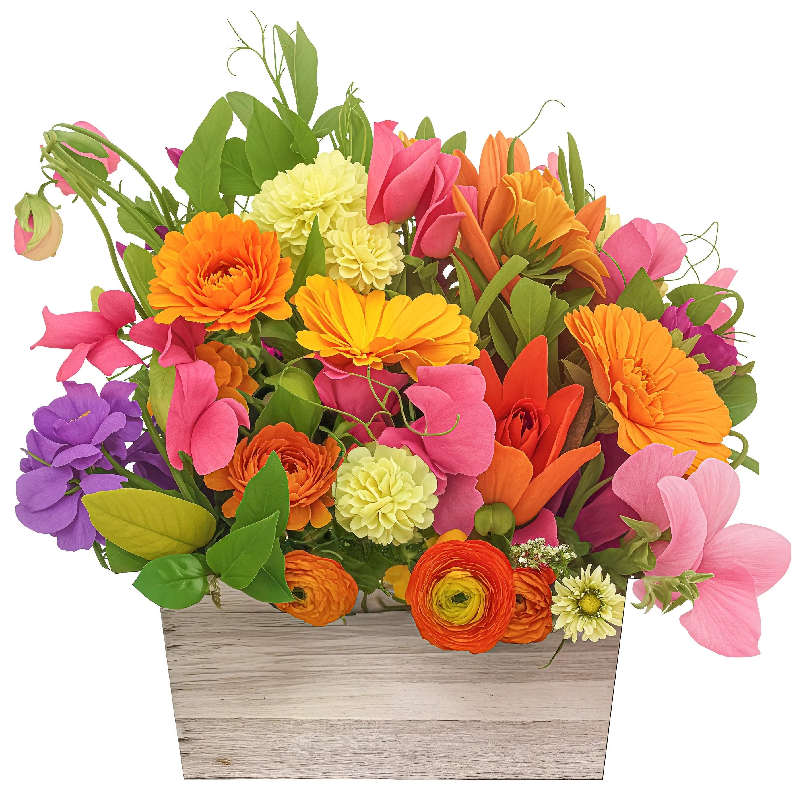Classic beauty is displayed with this arrangement of seasonal flowers with soft and vibrant colors showing the strength and power of the god of the sea (12'' tall and 10'' across)! It's perfectly displayed in an 8x8 wooden box with a great selection of flowers hand picked by our florist.