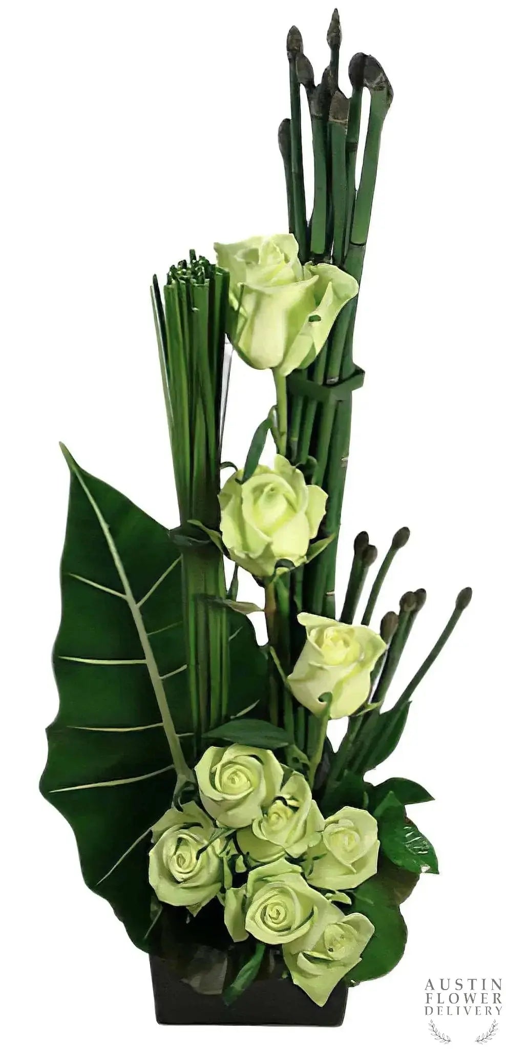Contemporary beauty and elegance are captured in this arrangement of green roses, horsetail, and bear grass (18'' tall and 7'' across). When horsetail isn't available we will use cane or other sticks.