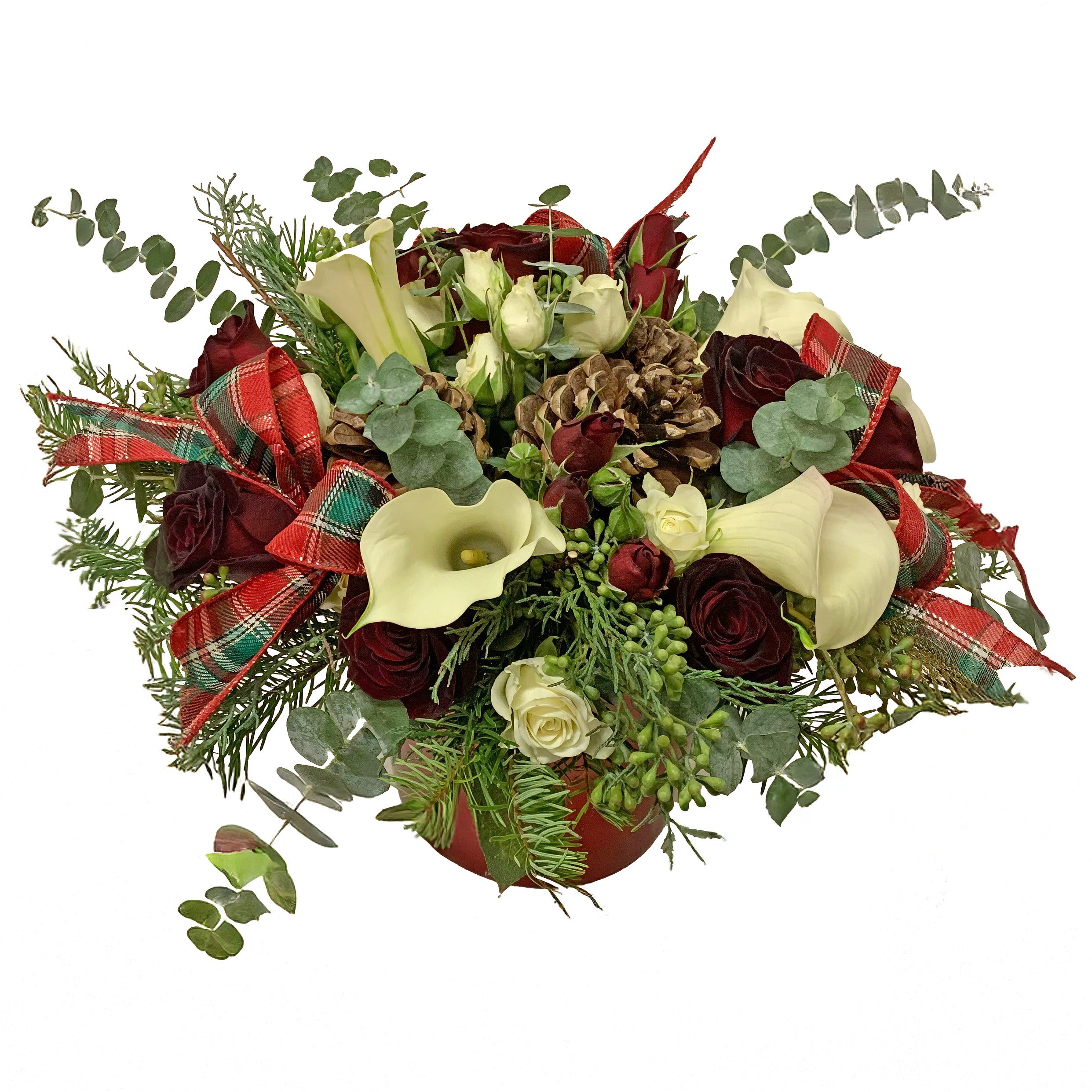 Celebrate the Holidays with this fabulous arrangement of white calla lilies, red roses, red and white spray roses, eucalyptus and plaid Christmas Ribbons. It's sure to feel like a down home country Christmas 🎄 with this beautiful centerpiece in your home (10'' tall and 10'' across)!