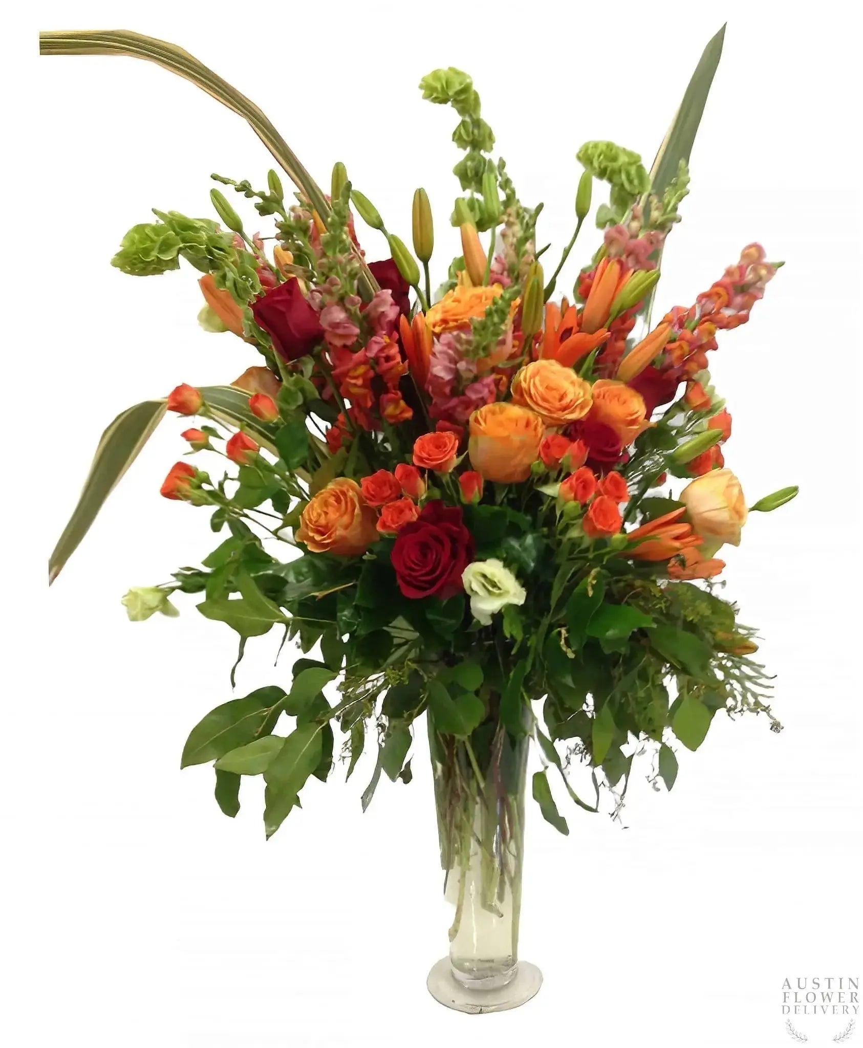 Celebrate a momentous occasion with this tall, gorgeous flower arrangement of warm-colored Roses, Lilies, Snap Dragons, and Greens in a tall glass vase (30-36'' tall and 20-24'' across). The vase shown is subject to availability and how far it's traveling.