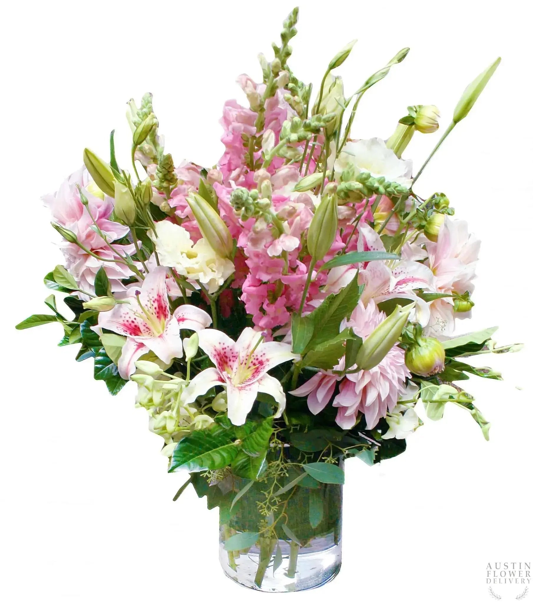 A truly feminine and beautiful arrangement of seasonal flowers in all shades of pink! Fill someone's heart with lots of love whispered through this piece (20'' tall x 15'' across)! Dahlias like these cafe au lait ones shown are only in season mid summer to late fall. When they are not in season, we will choose other pink flowers like roses or orchids to take their place.