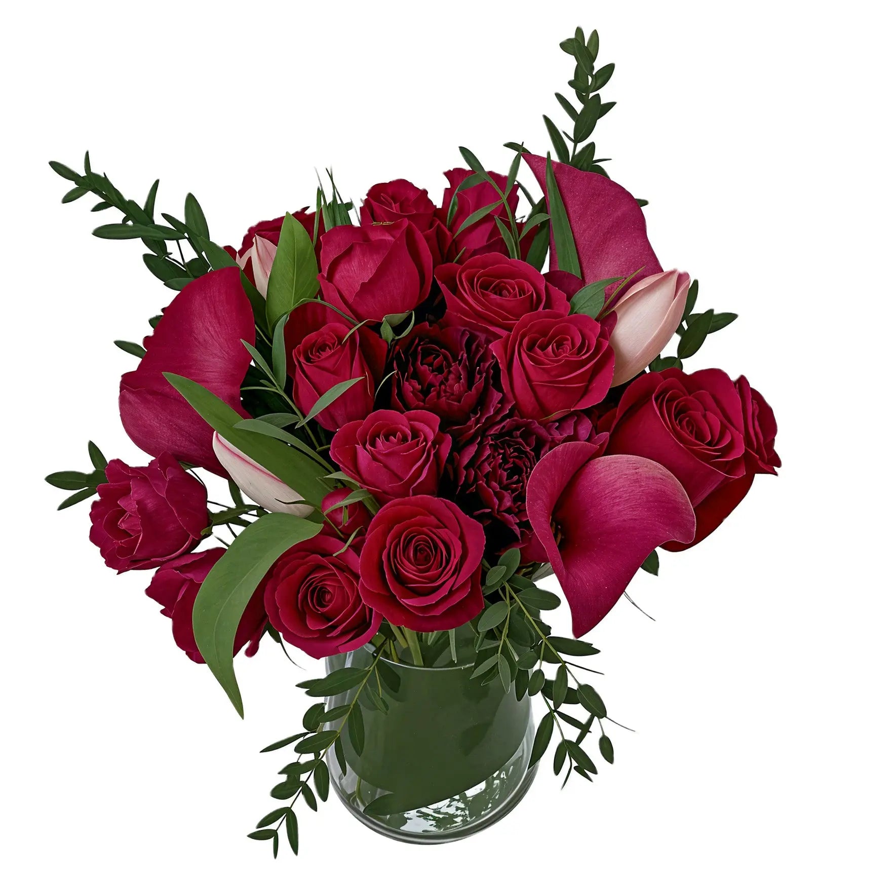 Bright colored roses, calla lilies, and seasonal reds fill this vase with lip-smacking arrangement of flowers (8'' tall and 6'' across)! Upgrades may include other colors and types of flowers.
