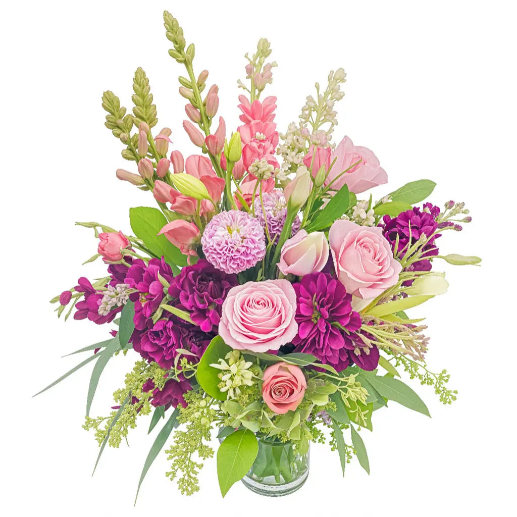 Spring is in full bloom with this arrangement of seasonal wild flowers, snapdragons, stock and roses in a chop style cylinder vase. If your outdoor garden is non-existent this arrangement will make up for it (Approximately 15'' tall and 10'' across)!