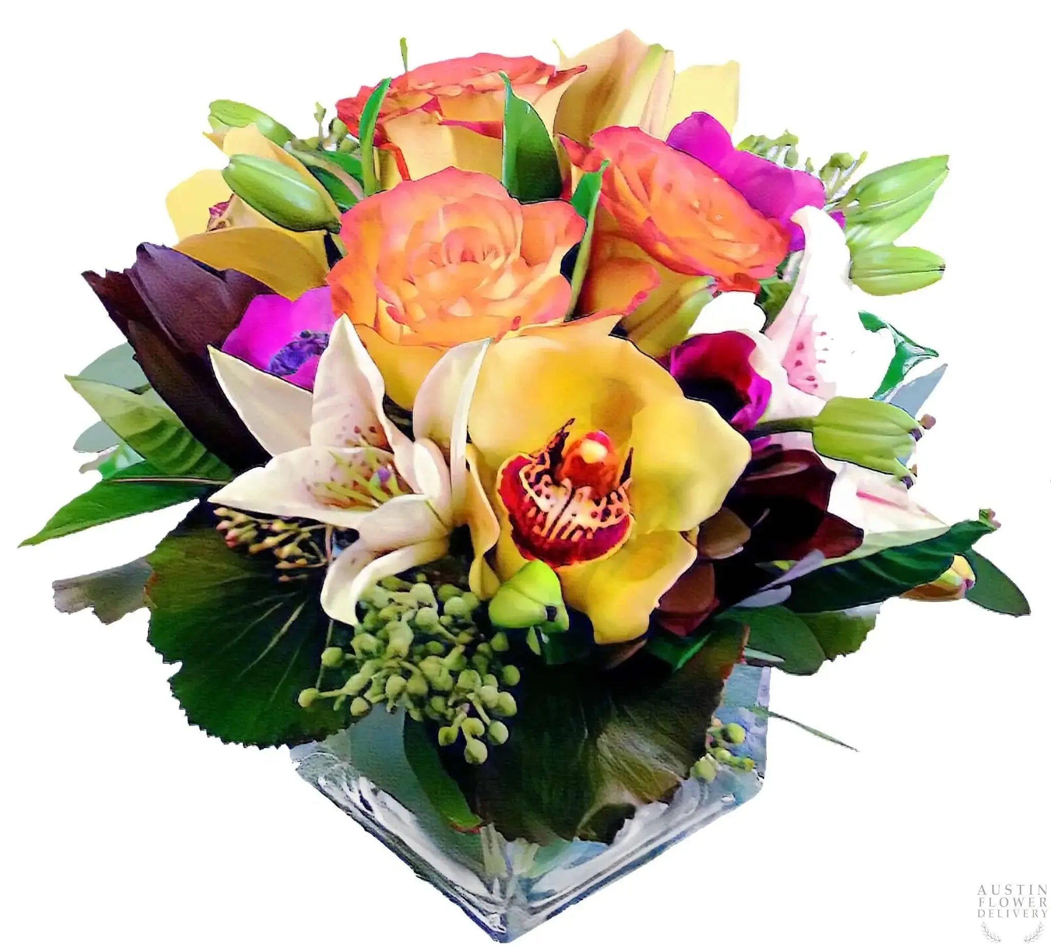 A bright arrangement of Circus Roses, Stargazer Lilies, Asiatic Lilies, Safari Sunset and other seasonal flowers. It's the perfect desk size or a great way to spruce up your home (8'' tall and 8'' across)!
