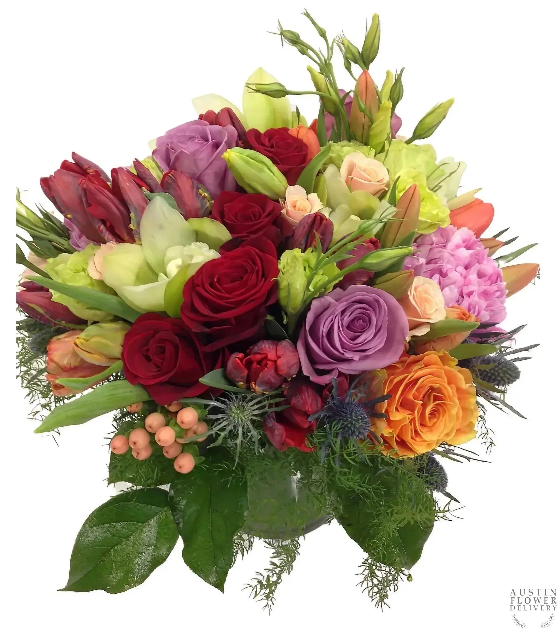 Happy thoughts are sure to abound and send your heart flying with this beautiful arrangement packed full of colorful flowers including several varieties of tulips, roses, lisianthus, orchids and other seasonal delights (12'' tall and 10'' across)!