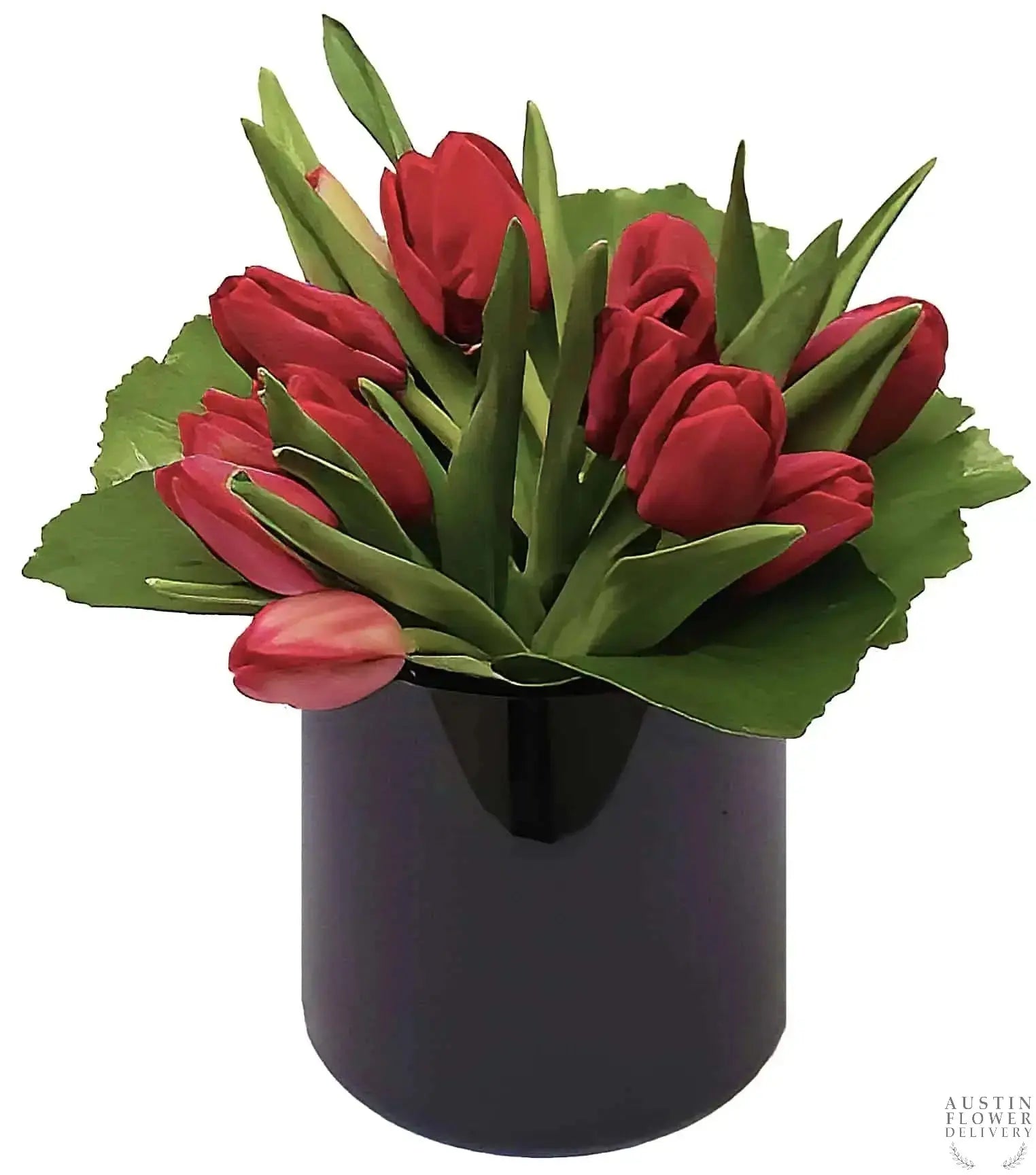 This simple design of a grower's bunch of tulips in a glass vase is sure to bring a bright pop of color for anyone who loves tulips. This stylish design will grow taller as the tulips bloom (7'' tall and 5'' across)! Colors may vary based on availability and upgrades may include other flowers.