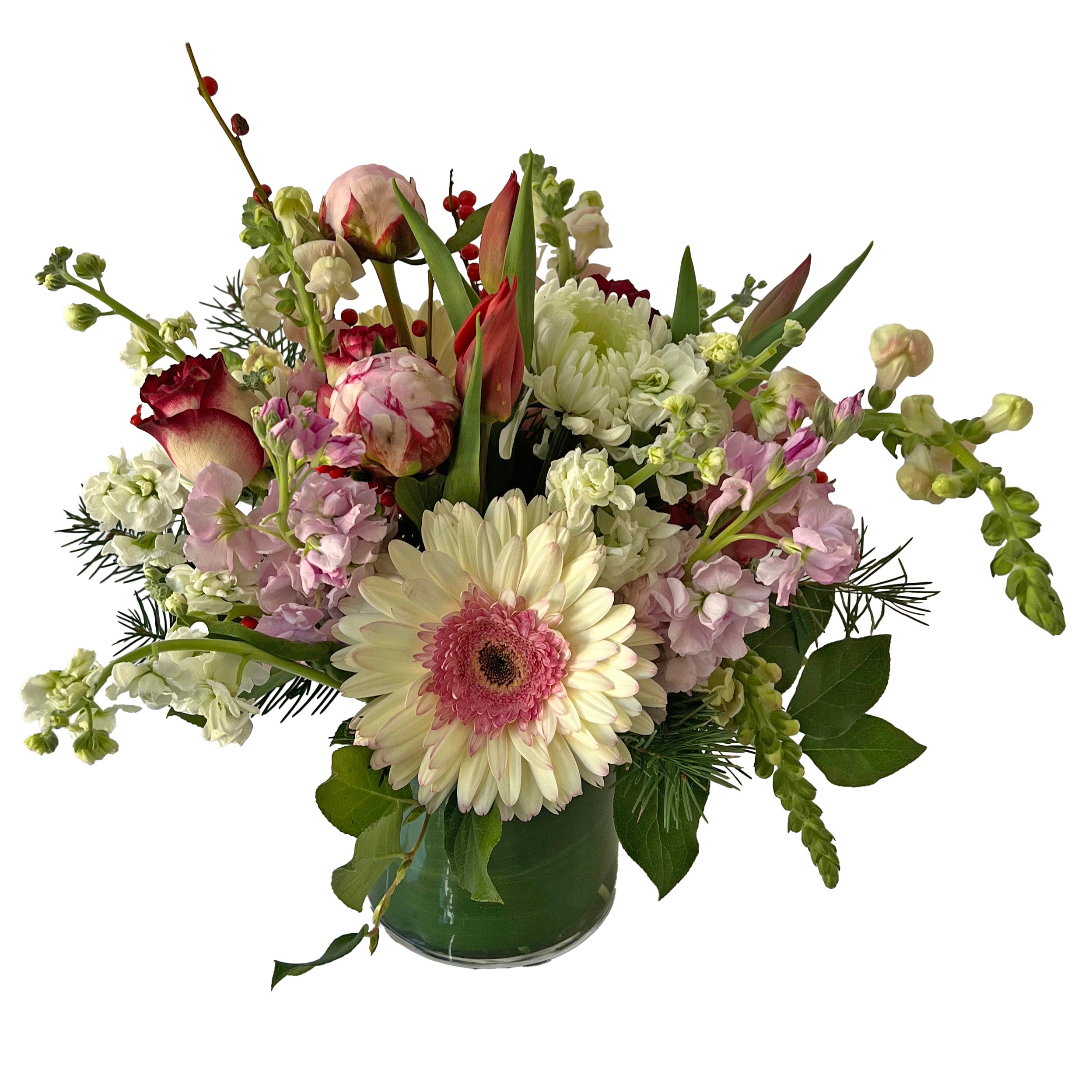 Blushing pinks and pure whites encapsulate youth and innocence in this sweet arrangement of gerbera daisies, peonies, roses and other garden flowers. Welcome a new baby or congratulate a new bride with this fun and light floral (8" tall and 8" across). Peonies are very seasonal for a short time in late spring/summer and again for a short time in winter, when not available they will be replaced with something of similar value.
