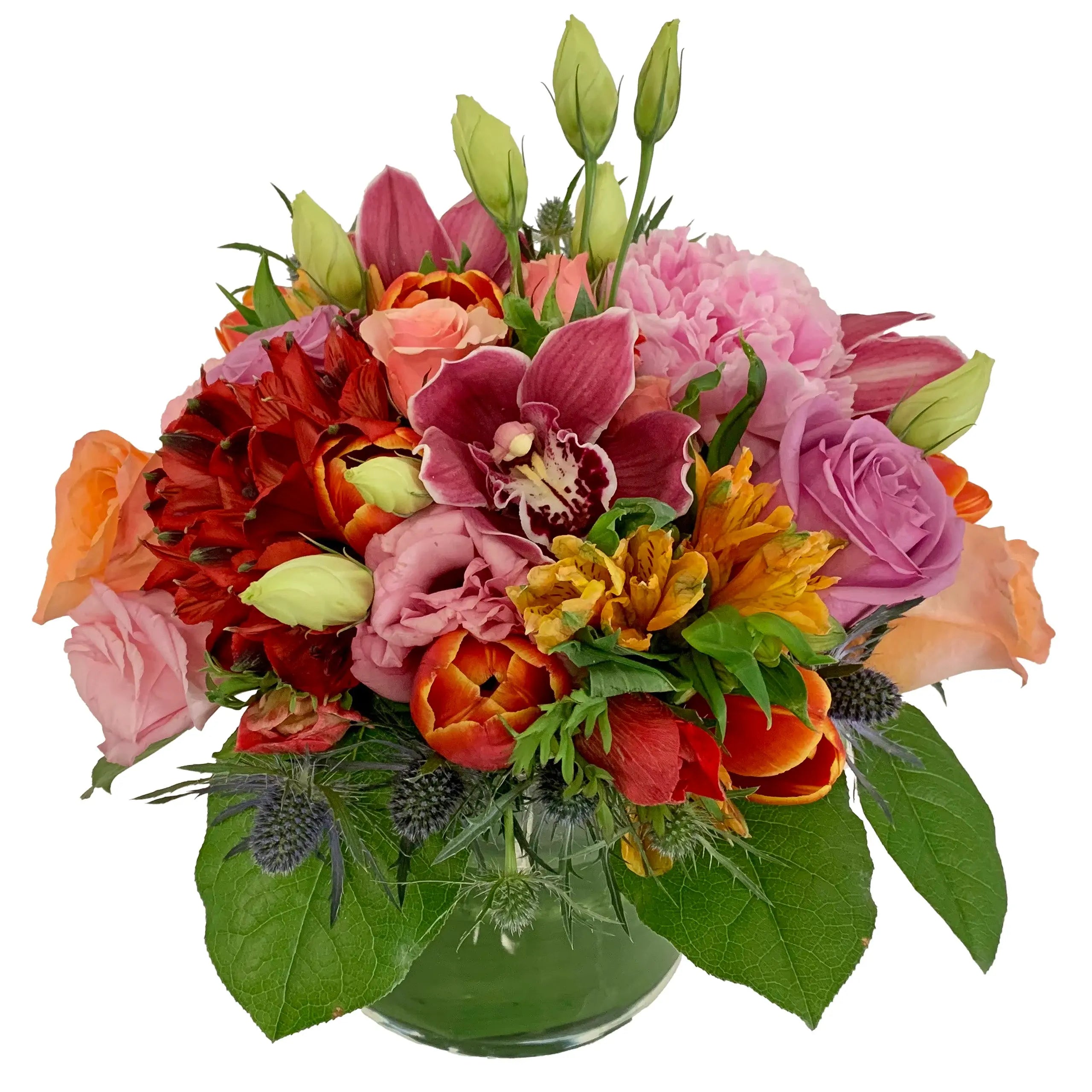 Imagine a beautiful sunset with pink, orange and amber colors radiating everywhere! This arrangement of flowers captures that sunset and sticks it in a vase to stare at well beyond sunset. It's a seasonal mix including roses, tulips, alstroemeria and whatever else the season brings. Flowers shown are from spring season. (8" tall and 8" across)!