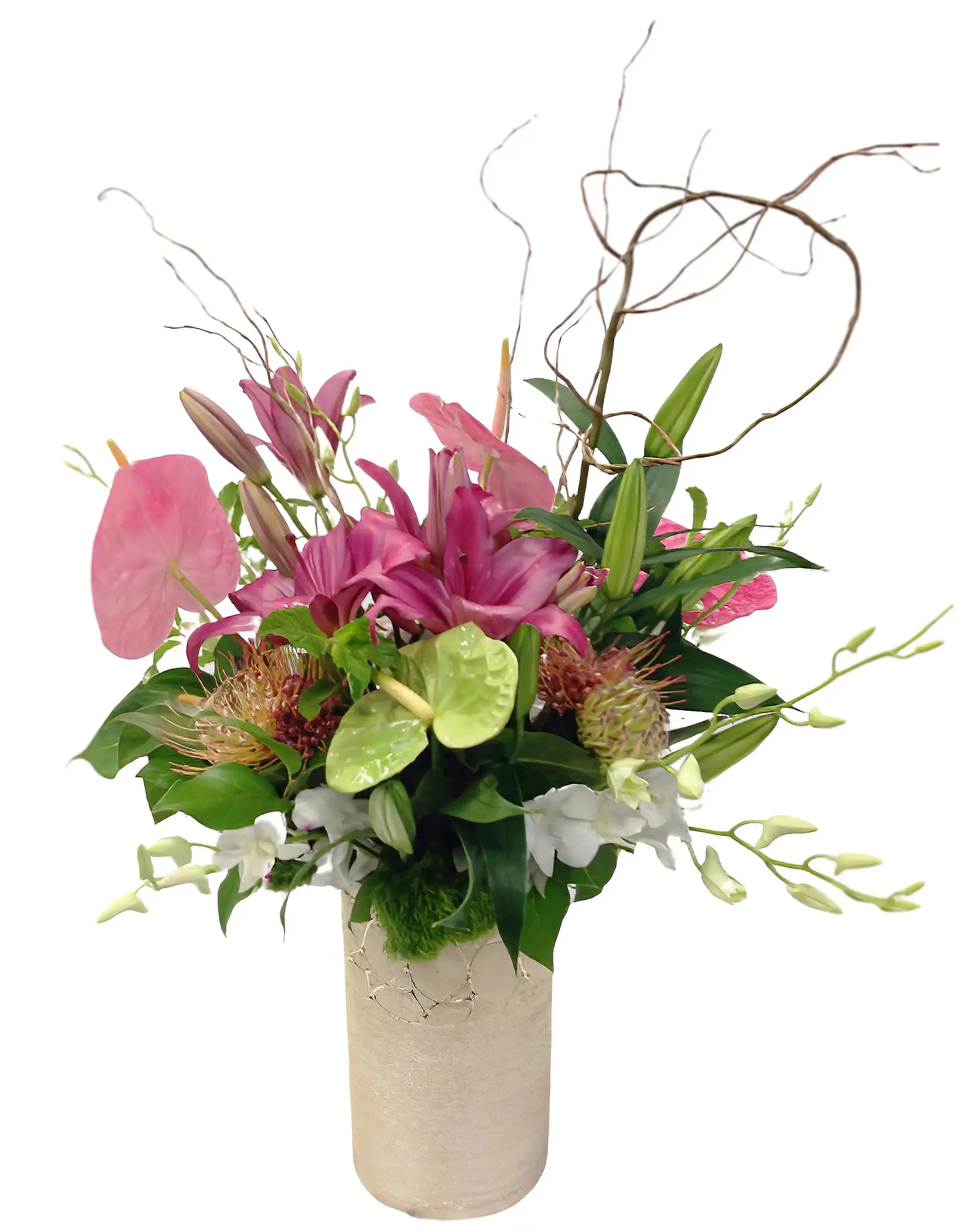 A beautiful ceramic vase chock full of pink lilies, pink and lime green anthurium, orange pincushions and white dendrobium orchids. These long-lasting flowers are sure to bring the tropical air inside (20-24'' tall and 15-18'' across)!