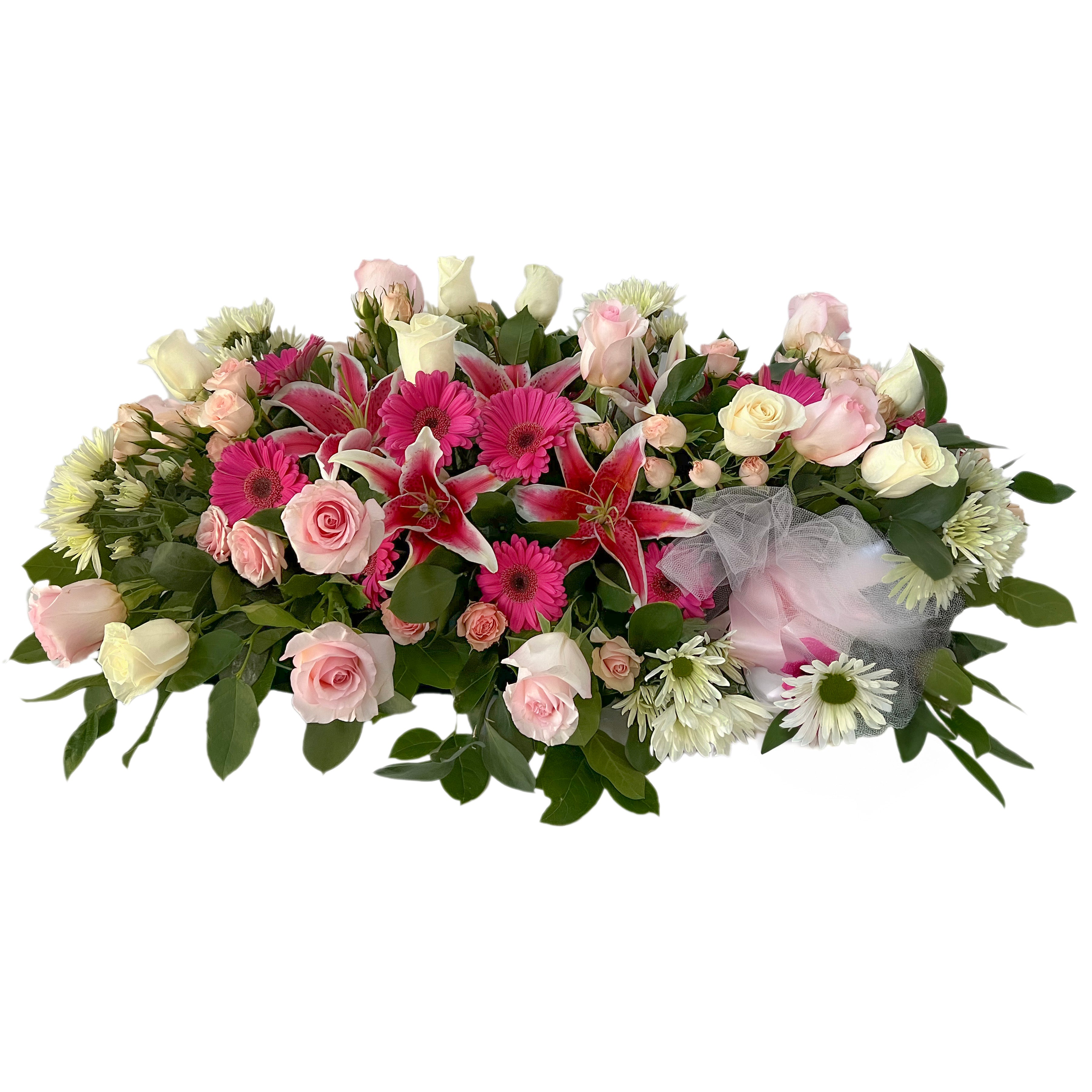 This gorgeous spray of stargazer lilies, gerbera daisies and roses is accented with spray roses and cushion mums for a beautiful and feminine spray of flowers to sit upon the lower portion of the casket when open. If you have a closed casket you can also put it in the middle or call us for a larger full casket spray if you want it to cover more. The spray is constructed in a saddle appropriate to a half or full casket piece. Please feel free to call us for pricing on a full casket piece at 210-796-6900. If you would prefer a different color scheme you can note it on the order and we'll call you if we have questions. (Approximately 15" tall and 24" across)