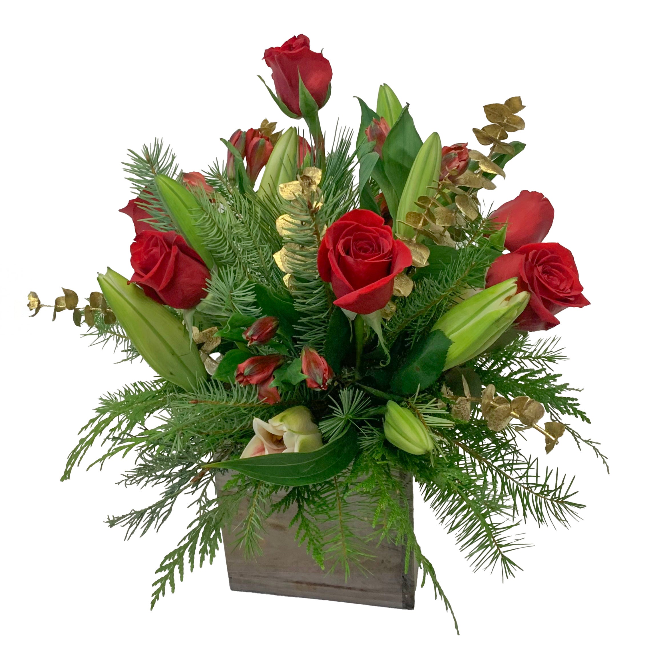 Looking for the perfect Holiday centerpiece? Look no further than this beautiful mix of lilies, roses, alstroemeria and other seasonal accents in a festive wooden box! (12'' tall and 10-12'' across)