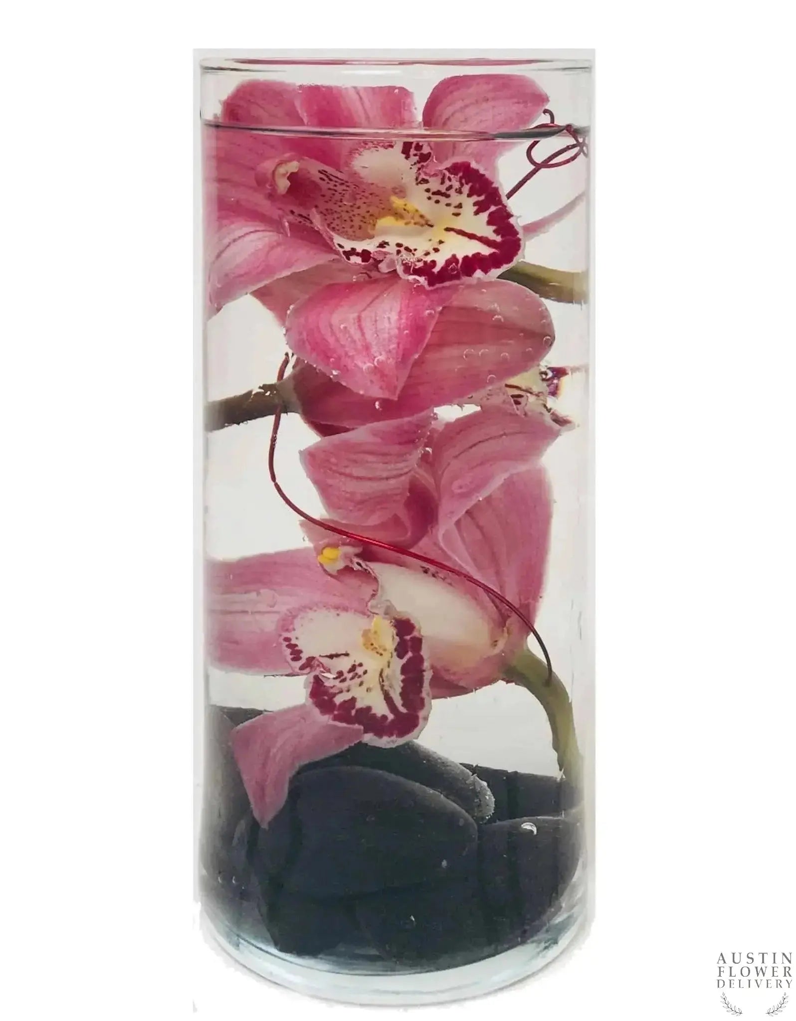 Floating cymbidium blooms fill this cylinder along with wire accents. The black rocks on the bottom create a wonderful contrast to the colorful orchids for a stunning petite centerpiece (7'' tall and 3'' across)!