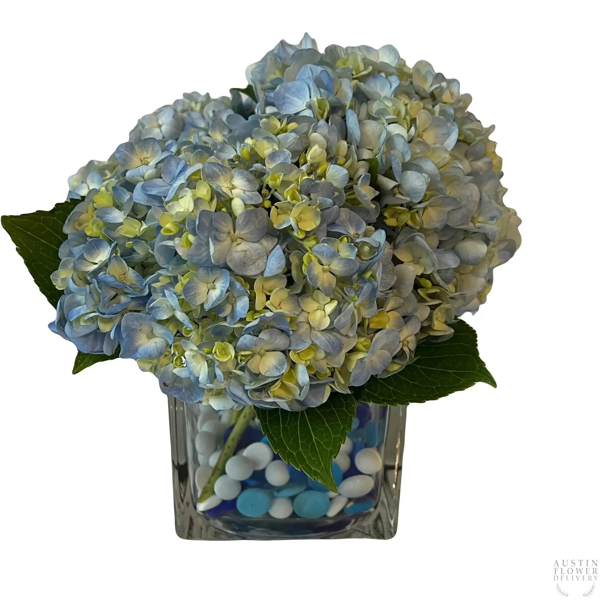 Blue hydrangea never sat so lovely as it does in this cube vase with blue stone accents. A truly summer design that brings the beach indoors (6'' tall and 6'' across). Vase may change due to availability and upgrades will include other flower types.