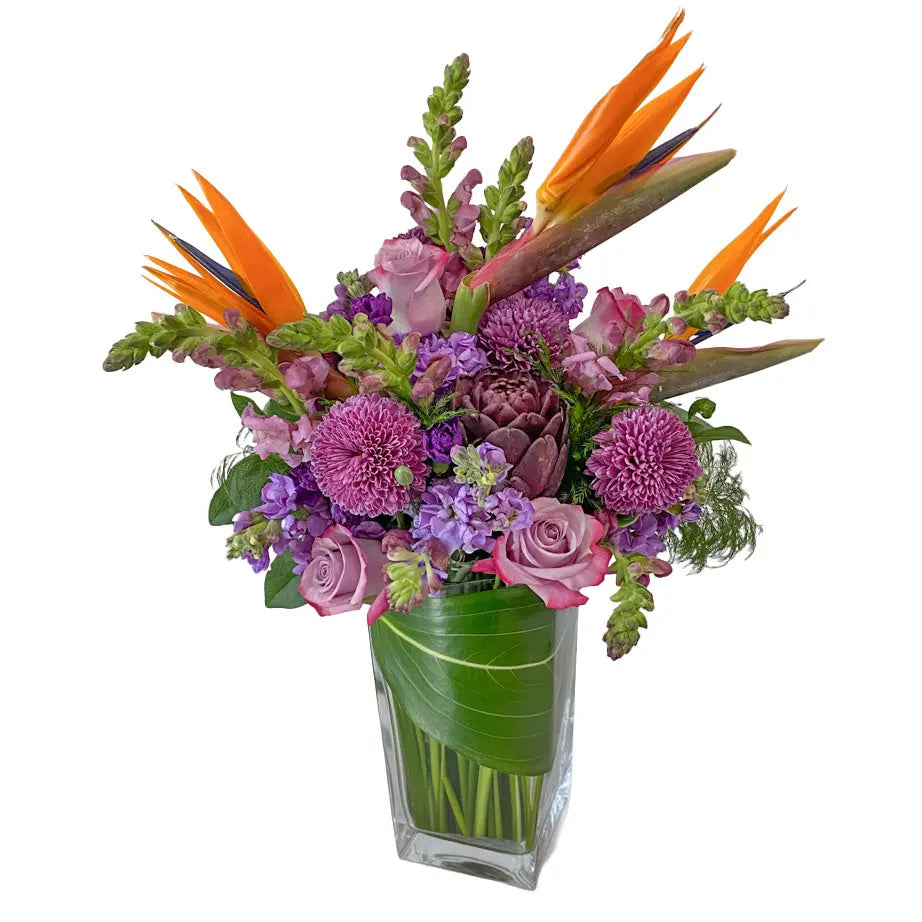 Birds of Paradise sit atop a beautiful mix of purple flowers in this fabulous arrangement of flowers! Dress up your home or office with this lush mix of exotic flowers sure to make your space sing with delight (Approximately 20'' tall and 15'' across)!