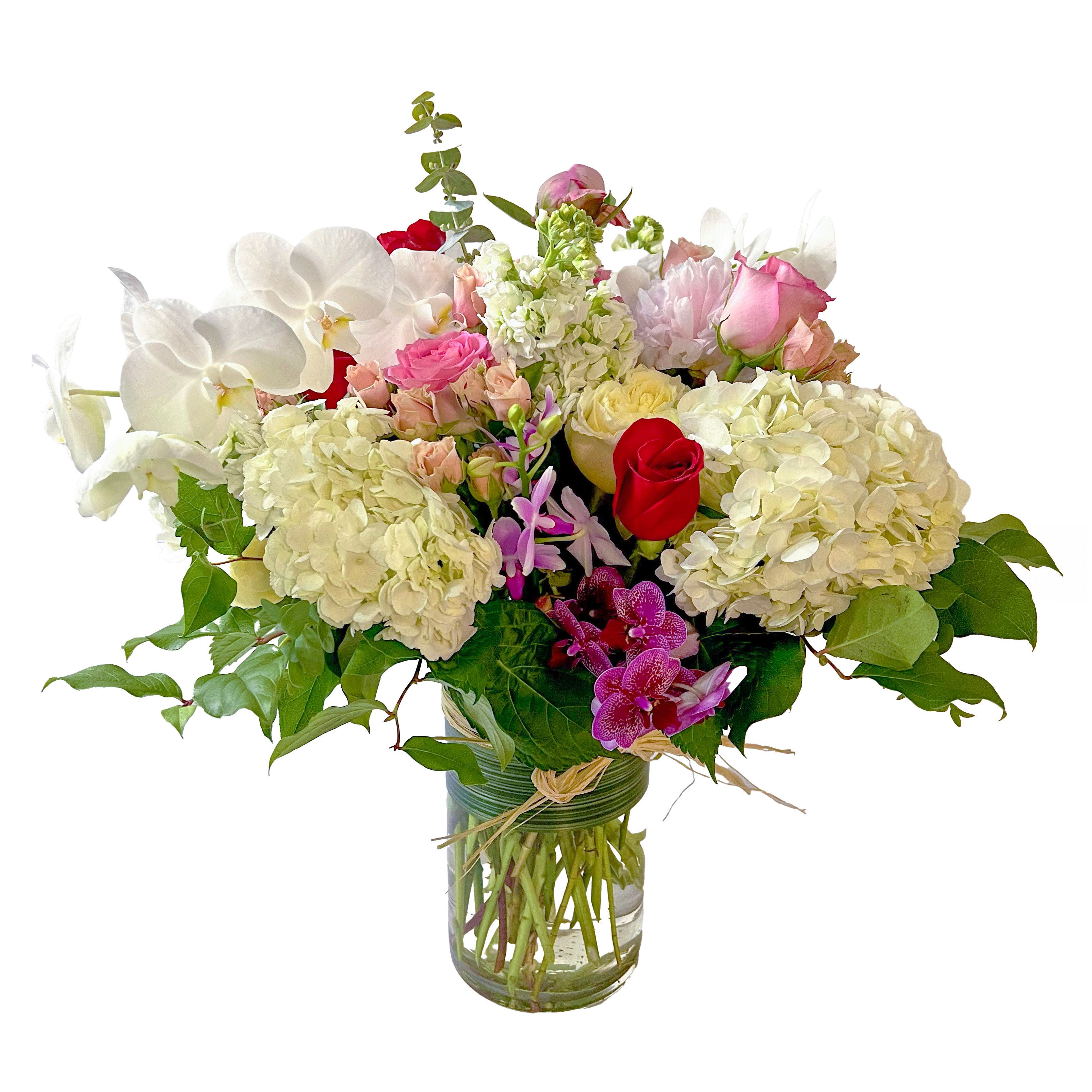 This tall and beautiful floral arrangement contains multiple stems of phalaenopsis orchids in a variety of colors and sizes as well as beautiful hydrangea, roses, spray roses and other seasonal favorites (18" tall and 18" across)! Orchid colors vary depending on availability, but will be some variety or pink, white or purple.