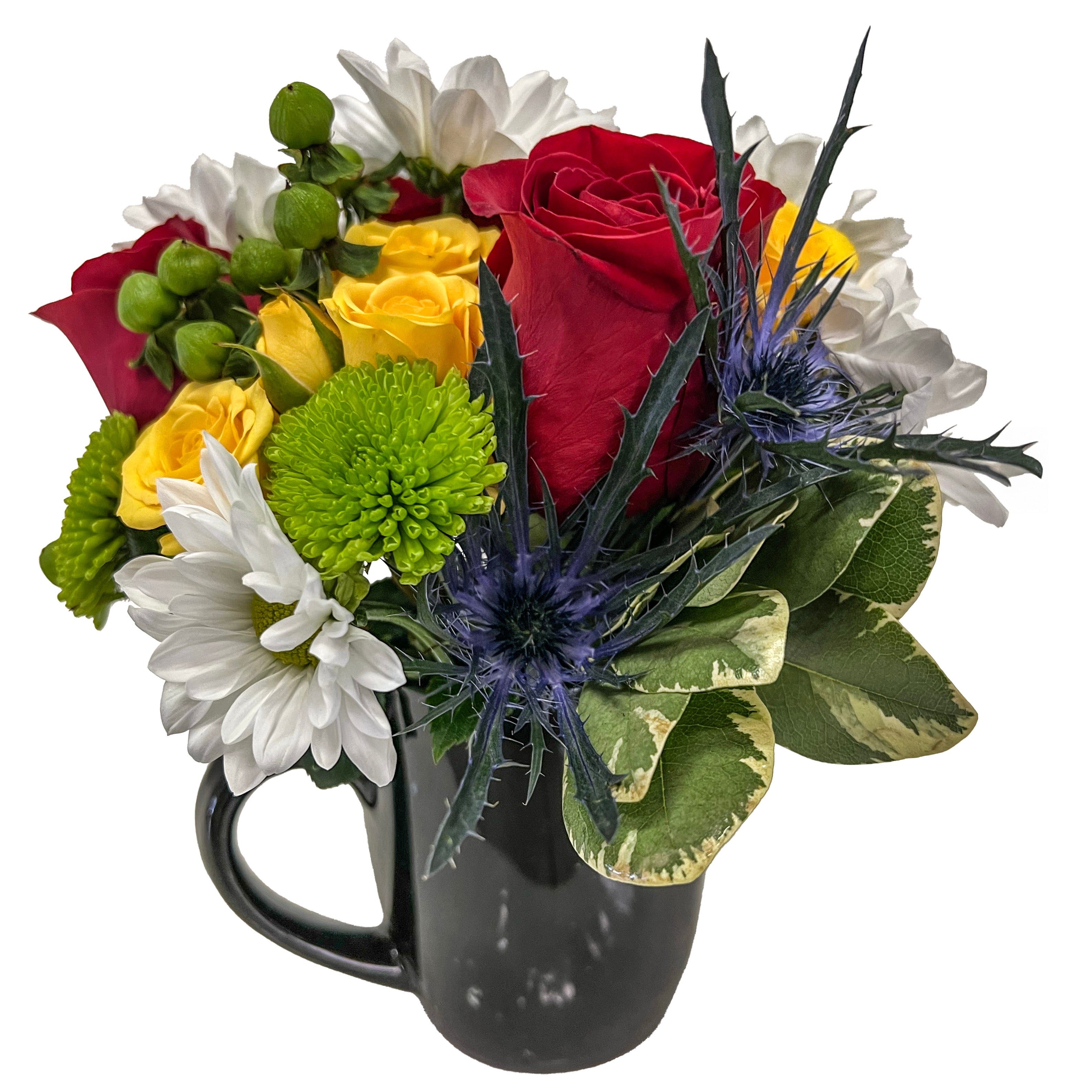 Now you can send anyone a cup of joy with this cute little arrangement of flowers nestled in a ceramic mug! It's sure to bring a smile to your face and joy to your heart (6" tall and 5" across)! When the flowers fade, the mug is free to hold a sip of your favorite drink making it super easy to recycle this container!